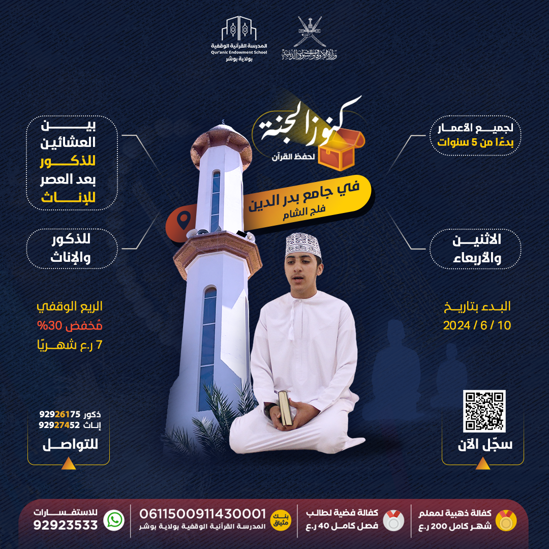 حلقات المدرسة القرآنية الوقفية بولاية بوشر حلقات تحفيظ القرآن في فلج الشام - بوشر - مسقط جامع بدر الدين المدرسة القرآنية الوقفية بولاية بوشر ✨حلقات تحفيظ القرآن الكريم بجامع بدر الدين - فلج الشام ✨📌جميع الأعمار للذكور والإناث من عمر 5 سنوات📌 الاثنين والأربعاء بين العشائين📌للتواصل: http://wa.me/96892926175 حلقات المدرسة القرآنية الوقفية بولاية بوشر المدرسة القرآنية الوقفية بولاية بوشر مقالات قد تهمك